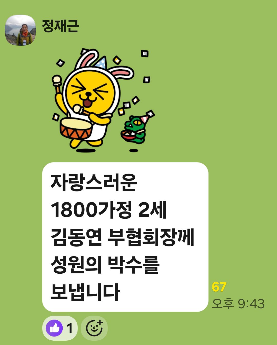 자랑스럽습니다 작성자 정보 김태순쪽지보내기 메일보내기 자기소개 아이디로 검색 전체게시물쪽지보내기 메일보내기 자기소개 아이디로 검색 전체게시물작성 8 조회 작성일2026.02.03 컨텐츠 정보 0댓글 본문 오늘은1800가정 자녀김동연 부협회장이중랑교회 순회1일 수련을 5시간 강의를 하였습니다.전국순회 156번째라고 합니다.1800가정2세의자랑이라 사진을 올려봅니다. SNS 공유 관련자료 댓글 2 개 김태순님의 댓글 김태순쪽지보내기 메일보내기 자기소개 아이디로 검색 전체게시물쪽지보내기 메일보내기 자기소개 아이디로 검색 전체게시물 작성일 02.03 08:15 그렇습니다. 두 달전 강남대교회에서도 예배시간부터 오후 4시까지 열강했는데 종래 통일교회사와는 완연히 디른 각도에서의 강의라 신선했고 자랑스런 1.8가정 함평 김우기 장로님의 아들이라 더 든든하고 예뻐보입니다^^1800가정 회장ㅡ박범주ㅡ <p><b><span style="font-size: 18pt;">그렇습니다.</span></b> </p><p><b><span style="font-size: 18pt;">두 달전 강남대교회에서도 예배시간부터 오후 4시까지 열강했는데 종래 통일교회사와는 완연히 디른 각도에서의 강의라 신선했고 자랑스런 1.8가정 함평 김우기 장로님의 아들이라 더 든든하고 예뻐보입니다^^</span></b></p><p><b><span style="font-size: 18pt;">1800가정 회장ㅡ박범주ㅡ</span></b></p> 김태순님의 댓글 김태순쪽지보내기 메일보내기 자기소개 아이디로 검색 전체게시물쪽지보내기 메일보내기 자기소개 아이디로 검색 전체게시물 작성일 02.03 08:17 <p><img src="https://www.1800.or.kr/data/editor/2602/f3a0eb796604aeeae55a590ae81f95cf_1770074214_4915.jpg" title="f3a0eb796604aeeae55a590ae81f95cf_1770074214_4915.jpg"><br style="clear:both;"><img src="https://www.1800.or.kr/data/editor/2602/f3a0eb796604aeeae55a590ae81f95cf_1770074231_7985.jpg" title="f3a0eb796604aeeae55a590ae81f95cf_1770074231_7985.jpg"><br style="clear:both;"> </p> 로그인한 회원만 댓글 등록이 가능합니다. 다음 천심원에서 만난 님들 작성일 2025.10.07 목록 × SNS 공유 우리광장 회원논단 신앙생활 건강상식 동호회 게시판