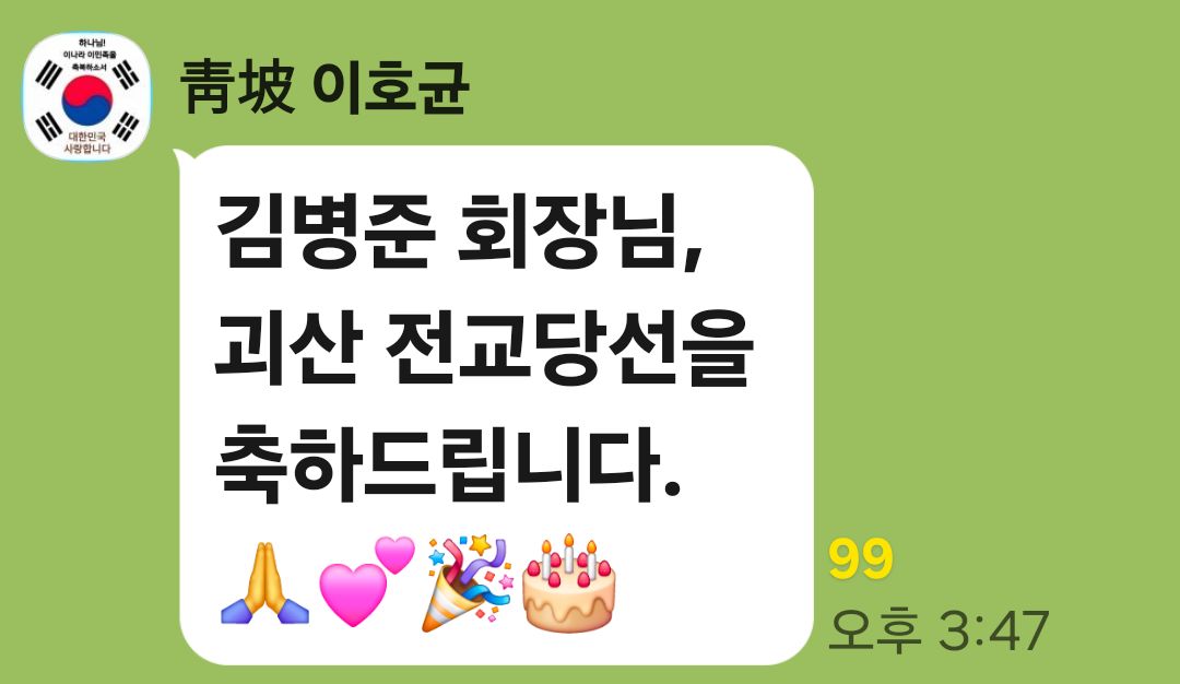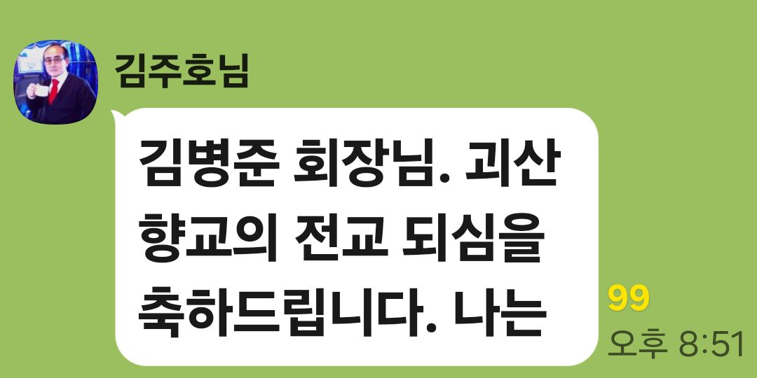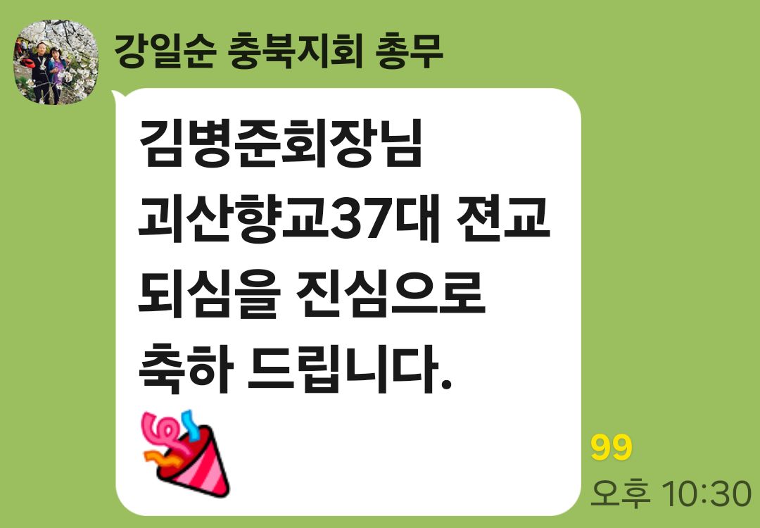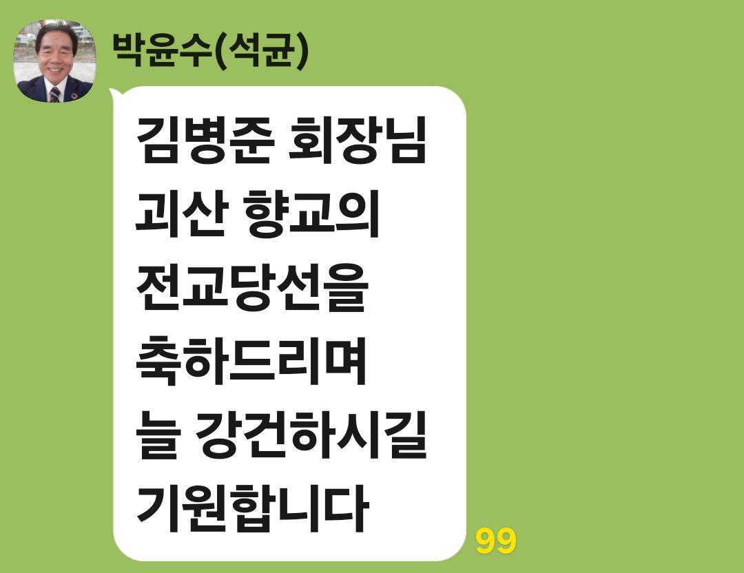 김병준 지회장님께서 그동안 참부모님으로부터 전수받은 심정과 말씀과 헌신으로 괴산 향교의 가장 존경받는 지도자가 되시길 전국의 우리 가정회 형제 자매들이 응원합니다.